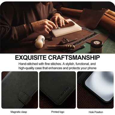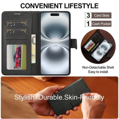 Detta eleganta fodral är tillverkat av PU-läder med kalvliknande textur och TPU-material, vilket ger en mjuk känsla och ett stilrent utseende. Det erbjuder 360-graders skydd för din telefon och kombinerar funktionalitet med design. Med två kortfack, ett fotofack och ett kontantfack kan du lämna plånboken hemma. Det vikbara stället gör det enkelt att titta på innehåll handsfree, medan det starka magnetlåset håller allt säkert på plats. Ett reserverat hål för högtalaren gör att du kan prata i telefon även med fodralet stängt.