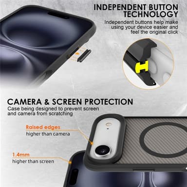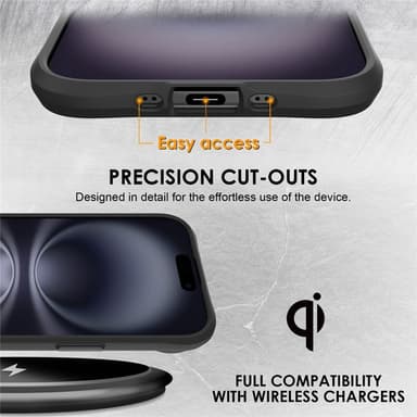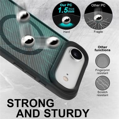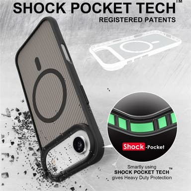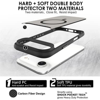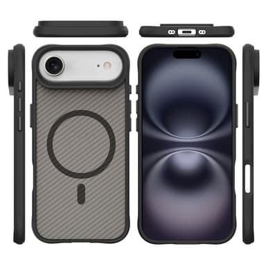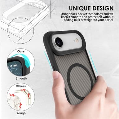 Detta mobilskal har en mikropräglad kolfibertextur som ger en mjuk och lyxig känsla samtidigt som det förhöjer telefonens utseende. Tillverkat av en kombination av TPU och PC-material erbjuder skalet både hållbarhet och flexibilitet för ett heltäckande skydd. Med hjälp av kompositplatteteknik och 38 starka magneter förbättras laddningseffektiviteten avsevärt, vilket säkerställer en stabil anslutning som är kompatibel med MagSafe-laddare. Upphöjda kanter på 1,4 mm över skärmen och extra skydd runt kameran ger ett starkt skydd mot repor och stötar.