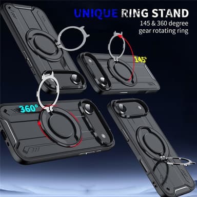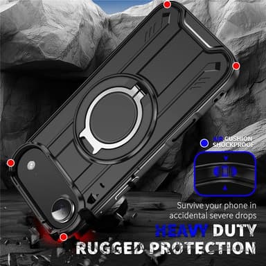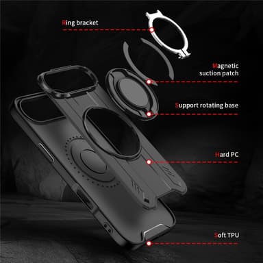 Detta mobilskal kombinerar hård PC och mjuk TPU för att ge en optimal balans mellan hållbarhet och flexibilitet. Den inbyggda 360° roterande ringen fungerar som ett praktiskt ställ för handsfree-visning, perfekt för videor och videosamtal. Den magnetiska ringen möjliggör smidig användning med MagSafe-laddare och magnetiska hållare, både hemma och i bilen. Luftkuddeskyddet ger effektiv stötdämpning vid fall, vilket skyddar din enhet från skador. Enkel att installera och ta bort utan att skada telefonen.