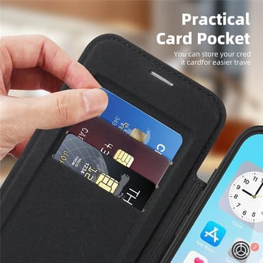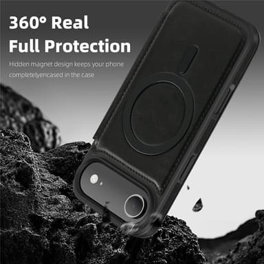 Detta eleganta skal erbjuder suveränt skydd med inbyggda magneter. Smidig MagSafe-kompatibilitet ger snabb trådlös laddning varje gång. Skalet är tillverkat av hållbar TPU och stilfullt PU-läder. Praktiska kortplatser rymmer enkelt ditt ID eller kreditkort. RFID-blockeringsteknik skyddar din personliga information mot obehörig skanning. Förhöjda kanter skyddar skärm och kamera effektivt.