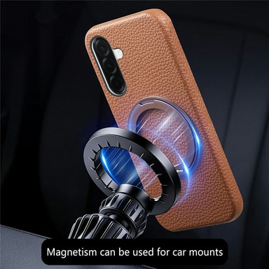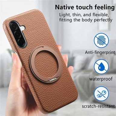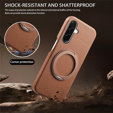Ett elegant och funktionellt mobilskal med magnetisk kompatibilitet för universella tillbehör. Inbyggda neodymmagneter ger starkt fäste för laddare och bilhållare. Den roterande ringen har en precisionsmekanism med mjuk 360° rotation och tydlig klickkänsla. Tre stödlägen möjliggör horisontellt videoläge, fingerhållning och vertikal placering. Det stötsäkra dubbellagerskyddet med förstärkta hörn skyddar effektivt mot fall. Tillverkat i litchi mönstrat PU/TPU-läder med mjuk känsla och reptålig yta. Ytan är motståndskraftig mot fingeravtryck, stänk och blekning för långvarig hållbarhet. MagSafe-kompatibel.
