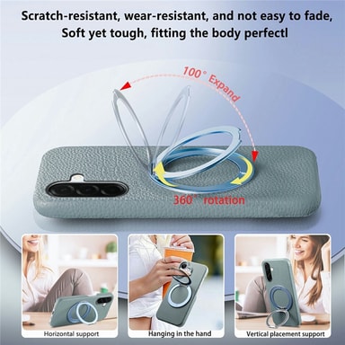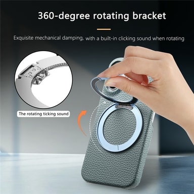 Ett elegant och funktionellt mobilskal med magnetisk kompatibilitet för universella tillbehör. Inbyggda neodymmagneter ger starkt fäste för laddare och bilhållare. Den roterande ringen har en precisionsmekanism med mjuk 360° rotation och tydlig klickkänsla. Tre stödlägen möjliggör horisontellt videoläge, fingerhållning och vertikal placering. Det stötsäkra dubbellagerskyddet med förstärkta hörn skyddar effektivt mot fall. Tillverkat i litchi mönstrat PU/TPU-läder med mjuk känsla och reptålig yta. Ytan är motståndskraftig mot fingeravtryck, stänk och blekning för långvarig hållbarhet. MagSafe-kompatibel.