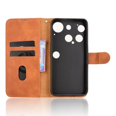 Detta fodral är tillverkat av TPU och PU-läder och erbjuder en lyxig känsla mot huden samtidigt som det ger hållbarhet och skydd. Med två inbyggda kortfack och en kontantficka blir det enkelt att organisera dina kort och kontanter när du är på språng. Det justerbara stödet möjliggör handsfree-användning, perfekt för att titta på videor eller videosamtal. Den magnetiska stängningen ger extra säkerhet för dina värdesaker. Fodralet skyddar din enhet mot repor, stötar och fall, och har ett handledsband för enkel transport samt ett främre utskärningshål för samtal med fodralet stängt.
