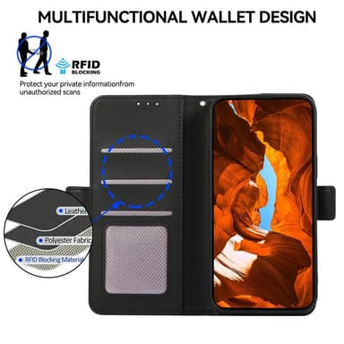 Detta eleganta fodral i PU-läder och TPU-material erbjuder hållbart skydd för din enhet. Den inbyggda RFID-blockeringstekniken skyddar din personliga information från obehöriga skanningar. Med en praktisk plånboksdesign får du plats för både kort och kontanter, vilket gör det enkelt att ha allt viktigt samlat. Fodralet kan även omvandlas till ett stativ för bekväm, handsfree visning. Den starka magnetiska stängningen håller telefon och kort säkert på plats.