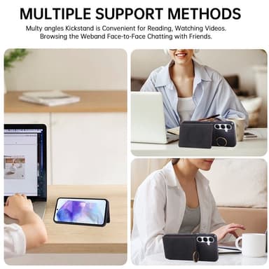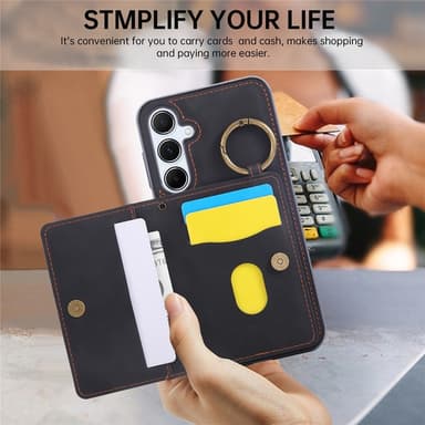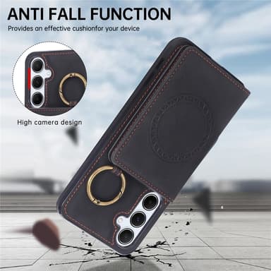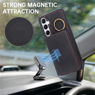 Detta mobilskal är tillverkat av slitstarkt TPU och PU-läder, vilket ger en lyxig känsla och pålitligt skydd. Den inbyggda korthållaren rymmer dina viktigaste kort och kontanter, säkert försluten med magnetlås för enkel åtkomst. Korthållaren fungerar även som ett praktiskt ställ för horisontell visning. En integrerad metallring ger ett säkert grepp, förbättrar fallskyddet och gör hanteringen smidigare. Den starka magneten på baksidan möjliggör fäste på magnetiska bilhållare. Upphöjda kanter runt kameran och stötdämpande material skyddar mot stötar, fall och fingeravtryck.