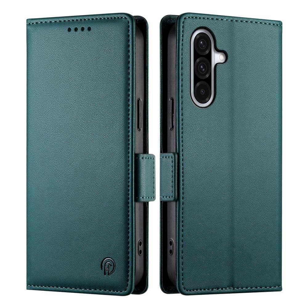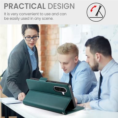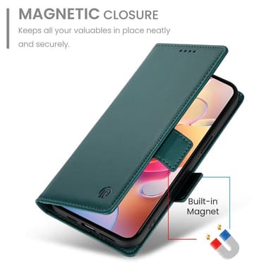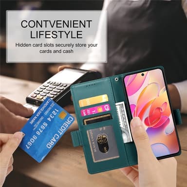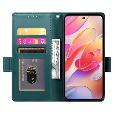 Detta fodral kombinerar ett mjukt TPU-inre skal med ett yttre lager av PU-läder, vilket ger både hållbarhet och en exklusiv känsla för långvarig användning. Den mångsidiga designen inkluderar tre kortfack och ett kontantfack, vilket gör att du kan bära med dig det viktigaste utan att behöva en separat plånbok. Magnetiska sidolås ger säker och smidig åtkomst till både telefon och kort, samtidigt som allt hålls på plats. Fodralet kan enkelt vikas till ett stativ, perfekt för att titta på videor eller ha videosamtal utan att hålla i telefonen. Det erbjuder heltäckande skydd mot stötar och repor, samtidigt som det behåller en tunn, stilren och elegant design.