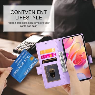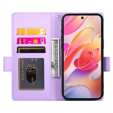 Detta fodral kombinerar ett mjukt TPU-inre skal med ett yttre lager av PU-läder, vilket ger både hållbarhet och en exklusiv känsla för långvarig användning. Den mångsidiga designen inkluderar tre kortfack och ett kontantfack, vilket gör att du kan bära med dig det viktigaste utan att behöva en separat plånbok. Magnetiska sidolås ger säker och smidig åtkomst till både telefon och kort, samtidigt som allt hålls på plats. Fodralet kan enkelt vikas till ett stativ, perfekt för att titta på videor eller ha videosamtal utan att hålla i telefonen. Det erbjuder heltäckande skydd mot stötar och repor, samtidigt som det behåller en tunn, stilren och elegant design.