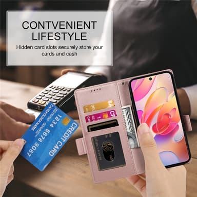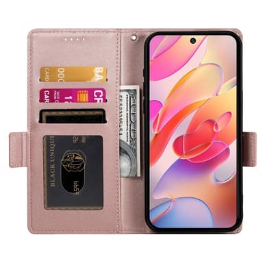 Detta fodral kombinerar ett mjukt TPU-inre skal med ett yttre lager av PU-läder, vilket ger både hållbarhet och en exklusiv känsla för långvarig användning. Den mångsidiga designen inkluderar tre kortfack och ett kontantfack, vilket gör att du kan bära med dig det viktigaste utan att behöva en separat plånbok. Magnetiska sidolås ger säker och smidig åtkomst till både telefon och kort, samtidigt som allt hålls på plats. Fodralet kan enkelt vikas till ett stativ, perfekt för att titta på videor eller ha videosamtal utan att hålla i telefonen. Det erbjuder heltäckande skydd mot stötar och repor, samtidigt som det behåller en tunn, stilren och elegant design.