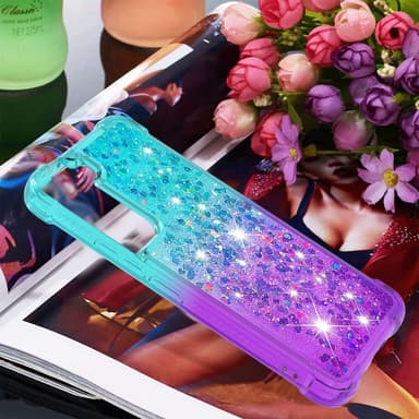 Ett TPU-skal med flyttande vätska med glitter och hjärtan som skyddar bra mot stötar och tappskador.