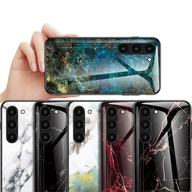 Ett slimmat TPU-skal med stilrent tryck och baksida i härdat glas för maximal känsla.