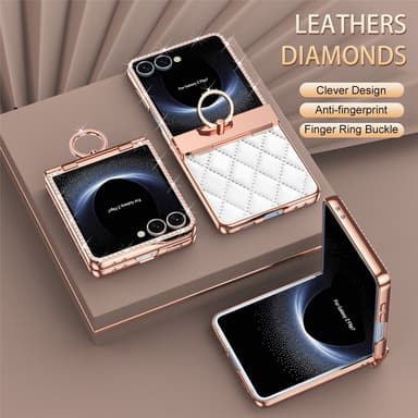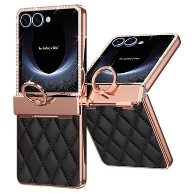 Detta eleganta fodral kombinerar stil och funktionalitet med en konstruktion av hård PC-plast täckt med PU-läder, vilket gör det motståndskraftigt mot repor och fingeravtryck. Den rombformade präglingen med strassdetaljer och rutnätsstruktur ger ett sofistikerat utseende. Den elektropläterade ramen tillför en glänsande finish, medan det härdade glaset på baksidan skyddar skärmen mot repor. Fodralet har även ett gångjärnsskydd som bevarar enhetens rörliga delar samt en praktisk ringhållare för bättre grepp.