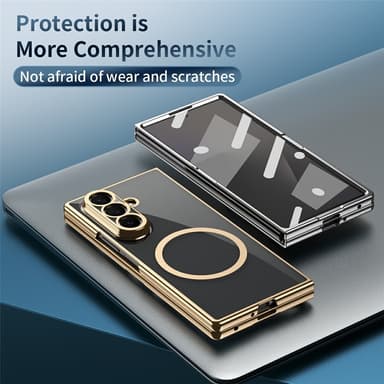 Detta eleganta fodral kombinerar stil och funktionalitet med en kristallklar transparens som motstår gulning och missfärgning över tid. Den inbyggda magnetiska ringen ger en säker anslutning till kompatibla tillbehör, medan den elektropläterade designen tillför en sofistikerad glans. Fodralet är särskilt utformat för vikbara skärmar och möjliggör smidig hopfällning utan att kompromissa med skyddet. Tillverkat i slitstarkt PC-material, erbjuder det ett lätt men robust skydd. Det medföljande härdade glaset ger ett extra lager skydd mot repor och stötar.