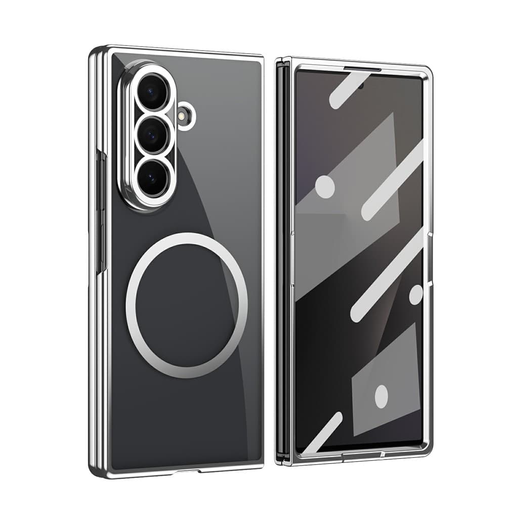 Detta eleganta fodral kombinerar stil och funktionalitet med en kristallklar transparens som motstår gulning och missfärgning över tid. Den inbyggda magnetiska ringen ger en säker anslutning till kompatibla tillbehör, medan den elektropläterade designen tillför en sofistikerad glans. Fodralet är särskilt utformat för vikbara skärmar och möjliggör smidig hopfällning utan att kompromissa med skyddet. Tillverkat i slitstarkt PC-material, erbjuder det ett lätt men robust skydd. Det medföljande härdade glaset ger ett extra lager skydd mot repor och stötar.