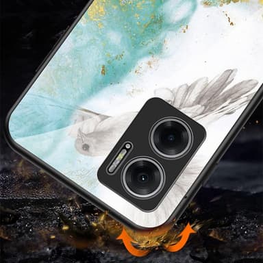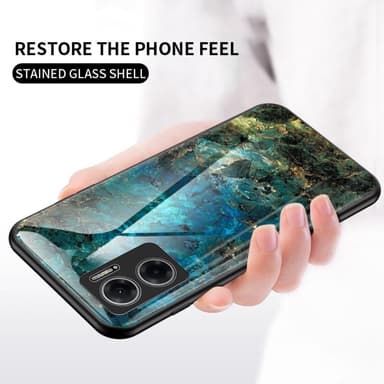 Ett slimmat TPU-skal med stilrent tryck och baksida i härdat glas för maximal känsla.
