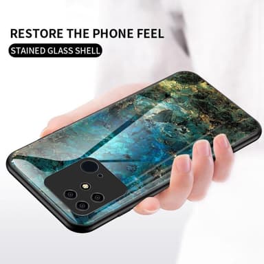 Ett slimmat TPU-skal med stilrent tryck och baksida i härdat glas för maximal känsla.