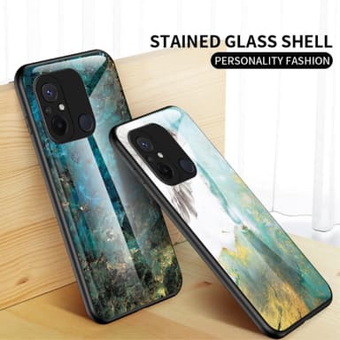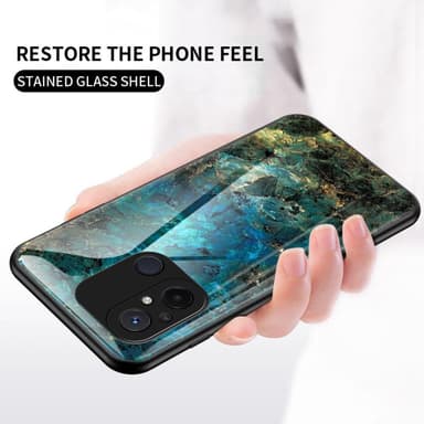 Ett slimmat TPU-skal med stilrent tryck och baksida i härdat glas för maximal känsla.