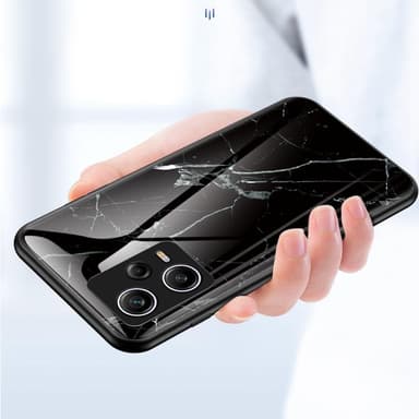 Ett slimmat TPU-skal med stilrent tryck och baksida i härdat glas för maximal känsla.