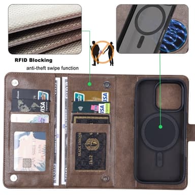 Unna dig lyxen av en premium PU-läderplånbok och ett tåligt PC + TPU-skal, perfekt kombinerade för både stil och funktion. Den avtagbara designen ger dig friheten att använda plånboken separat eller tillsammans med telefonen, medan MagSafe-kompatibiliteten garanterar enkel och säker laddning. Känn dig trygg med RFID-blockeringstekniken som skyddar dina kort från obehörig scanning. Din telefon skyddas optimalt från fall och repor tack vare det robusta skalet. Njut av den mångsidiga 2-i-1-designen som ger dig det bästa av två världar.