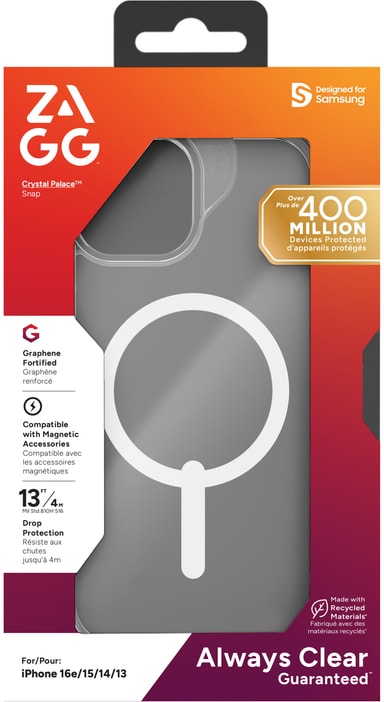 Zagg Crystal Palace Apple iPhone 16E/17E/15/14/13 fodral erbjuder snyggt skydd med reptålig yta, 4m fallskydd och gulningsmotstånd.Läs mer om produkten