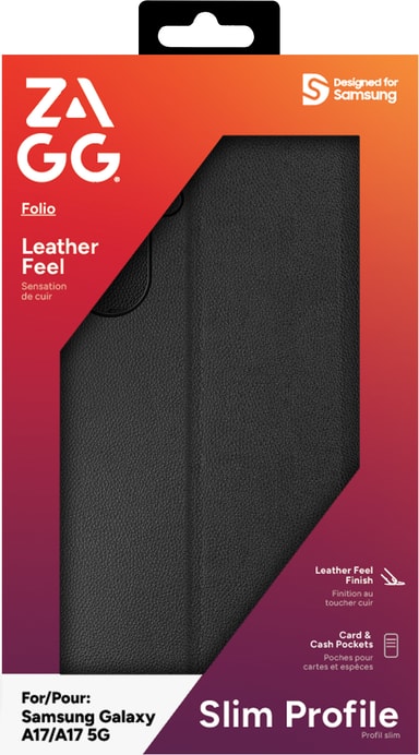 Zagg Folio Samsung Galaxy A17/A17 5G plånboksfodral erbjuder elegant skydd med läderkänsla, fingeravtrycksmotstånd och kortfack i en smal, fickvänlig design med snäppmontering och stöd för bättre visning.