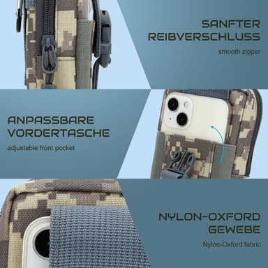 Det taktiska fodral är perfekt för friluftsentusiaster. Väskan är tillverkad av högkvalitativ, stänkskyddad och nötningsbeständig polyester och är robust och skyddar din telefon från repor och skador. Kamouflage-looken ger den en snygg militär designLäs mer om produkten