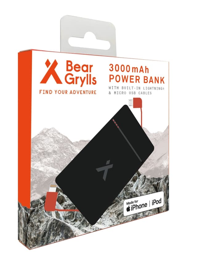 Charge your adventure: The Bear Grylls 3000mAh Power Bank is a pocket-sized power bank with 3000mAh battery capacity. Keep this emergency backup charge on you with its lightweight and compact design and two built-in cables, all-in-one and ready to go.