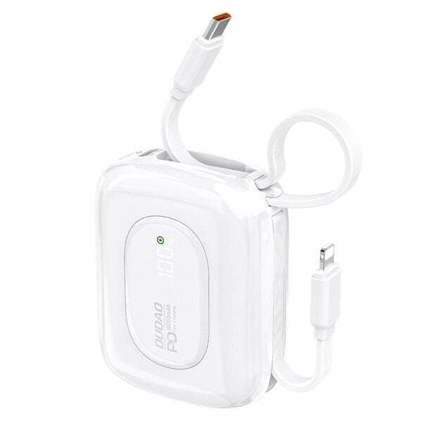 Dudao Powerbank 22,5W 10000mAh med inbyggd USB-C- och lightningkabel - Vit