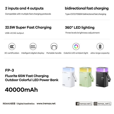 REMAX FP-3 är en kraftfull och robust powerbank framtagen för utomhusbruk, camping, resor eller nödsituationer. Med en kapacitet på 40000mAh, stöd för 65W snabbladdning och inbyggd 360° LED-lampa erbjuder den både ström och ljus när du behöver det mest.