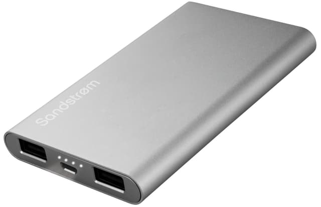 Detta är en Powerbank från Sandstrøm som du kan ta med i farten. Ladda upp enheten hemma och se till att du alltid har en trådlös laddare med dig. Batteriet är hållbart och har två USB-portar så att du kan ladda upp till två enheter samtidigt. Den har även auto-on, auto-off och fyra stycken LED-indikatorer som visar batterinivån.
