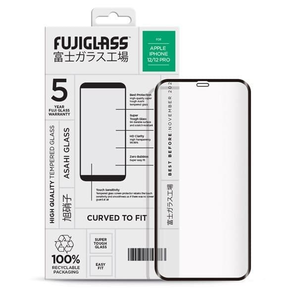 Fuji Curved härdat Skärmskydd till Apple iPhone 12 / 12 Pro Fuji Curved Tempererat displayskydd är tillverkad med premium japanskt härdat glas och lim för att säkerställa bästa skydd och vidhäftning på din smartphone. Limmet med hög viskositet säkerställer stark vidhäftning och hjälper till att förhindra att den lossnar. Kanterna har ett anti-dammskikt som förhindrar att glasskyddets kanter lyfter - ett vanligt problem med andra böjda kantskärmskydd på marknaden. Det ger optimalt skydd när det används i kombination med ett Mobilfodral Fuji Curved skärmskydd erbjuder samma högkvalitativa material och skydd som standard FUJI GLASS-serien fast med den extra böjda kanten. Dessa skärmskydd är nio gånger hårdare än vanligt glas och har en 0,33 mm ultratunn, repbeständig, rundad kantkonstruktion med hög upplösning. En rengöringssats tillhandahålls som inkluderar en rengöringsduk, mikrofiberduk och klistermärke för dammborttagning för att säkerställa en damm- och bubbelfri installation. Skärmskyddet passar Apple iPhone 12 / Apple iPhone 12 Pro