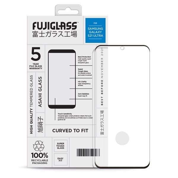 Fuji Curved härdat Skärmskydd till Samsung Galaxy S21 Ultra Fuji Curved Tempererat displayskydd är tillverkad med premium japanskt härdat glas och lim för att säkerställa bästa skydd och vidhäftning på din smartphone. Limmet med hög viskositet säkerställer stark vidhäftning och hjälper till att förhindra att den lossnar. Kanterna har ett anti-dammskikt som förhindrar att glasskyddets kanter lyfter - ett vanligt problem med andra böjda kantskärmskydd på marknaden. Det ger optimalt skydd när det används i kombination med ett Mobilfodral Fuji Curved skärmskydd erbjuder samma högkvalitativa material och skydd som standard FUJI GLASS-serien fast med den extra böjda kanten. Dessa skärmskydd är nio gånger hårdare än vanligt glas och har en 0,33 mm ultratunn, repbeständig, rundad kantkonstruktion med hög upplösning. En rengöringssats tillhandahålls som inkluderar en rengöringsduk, mikrofiberduk och klistermärke för dammborttagning för att säkerställa en damm- och bubbelfri installation. Skärmskyddet passar Samsung Galaxy S21 Plus Ultra