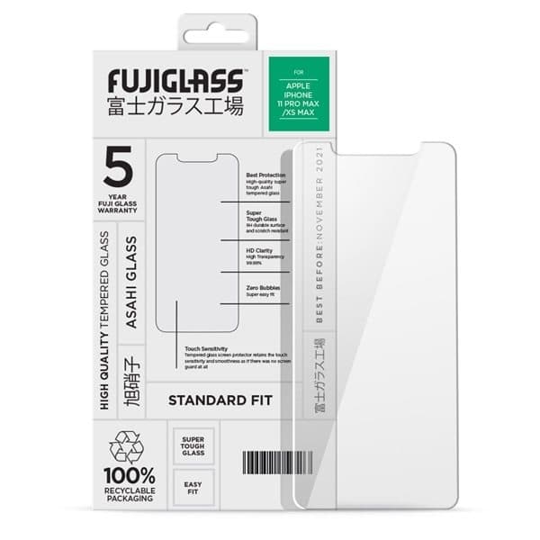 Fuji Standard Tempererat Skärmskydd till iPhone 11 Pro Max / iPhone XS Max Fuji Standard Tempererat displayskydd är tillverkad med premium japanskt härdat glas och lim för att säkerställa bästa skydd och vidhäftning på din smartphone. Limmet med hög viskositet säkerställer stark vidhäftning och hjälper till att förhindra att den lossnar. Det ger optimalt skydd när det används i kombination med ett Mobilfodral Dessa skärmskydd är nio gånger hårdare än vanligt glas och har en 0,33 mm ultratunn, repbeständig, rundad kantkonstruktion med hög upplösning. En rengöringssats tillhandahålls som inkluderar en rengöringsduk, mikrofiberduk och klistermärke för dammborttagning för att säkerställa en damm- och bubbelfri installation. Skärmskyddet passar Apple iPhone 11 Pro Max / Apple iPhone XS Max