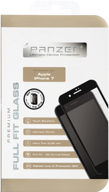 Panzer Full-Fit Tempered Glass skärmskydd till iPhone 7. Täcker hela skärmen och har ett tempererat glas som är nio gånger hårdare (9H) än vanligt glas. Endast 0,33 mm tunt.Läs mer om produkten