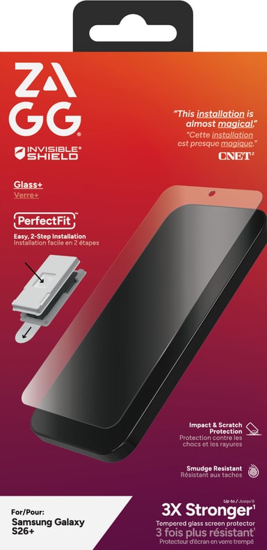 Zagg Glass Elite skärmskydd för Samsung Galaxy S26+ ger pålitligt glasskydd med ClearPrint smutsmotstånd och PerfectFit-installation, vilket håller din skärm säker och klar samt ger enkel och exakt montering. Tillverkat av ultrastarkt aluminosilikatglas, Glass Elite är noggrant testat för att ge pålitligt skydd för din enhet.