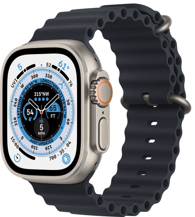 Always-On Retina-skärmen är den största Apple Watch-skärmen någonsin och har en otrolig ljusstyrka på upp till 2000 nit, vilket gör det enkelt att tyda skärmen även i direkt solljus. Wayfinder-urtavlan för Apple Watch Ultra har ett tidsvred med en live-kompass och annan statistik och kan växlas till ett livfullt rött nattläge genom att vrida på den digitala kronan.