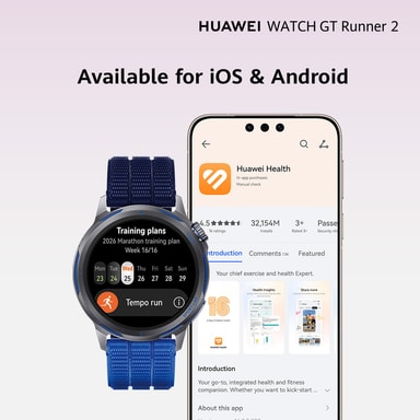 Huawei Watch GT Runner 2 smartklocka ger precision för din träningsresa. Designad för idrottare och träningsentusiaster med sin 1,32" AMOLED-skärm, ultraprecisions-GPS, Intelligent Marathon Mode och avancerad hälsoövervakning. Tillverkad av premiummaterial och med upp till 14 dagars batteritid, är den byggd för att hänga med i din aktiva livsstil, oavsett om du använder en iOS- eller Android-enhet.