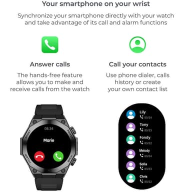 Den levereras med två utbytbara armband: ett sportigt silikonarmband och ett elegant armband i rostfritt stål, vilket gör den perfekt för både vardag och mer sofistikerade tillfällen.