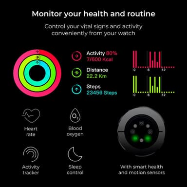 - Hälsoövervakning av hjärtfrekvens, blodtryck, syremättnad och sömnkvalitet