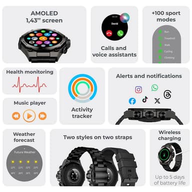 KSIX Titanium smartwatch levererar en förstklassig visuell upplevelse med sin 1,43"" AMOLED-multipekskärm, en upplösning på 466 x 466 pixlar och livfulla färger