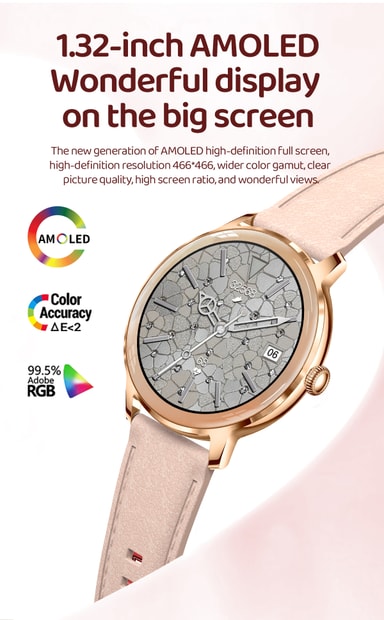 Snygg och funktionell: Denna smartklocka har en modern design med ett bekvämt silikonband. Den 1,32 tum stora AMOLED-skärmen ger en tydlig och levande bild. Anpassa din urtavla med en mängd olika alternativ som passar din stil.