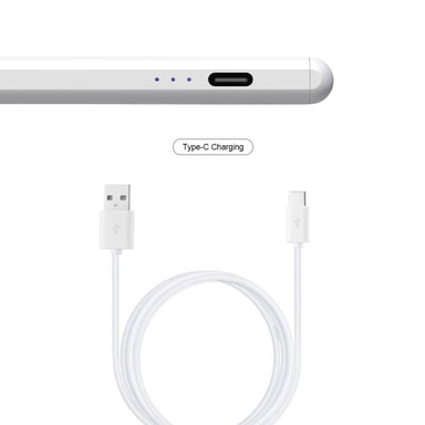 Spetsen är utbytbar och pennan stängs automatiskt av efter 5 min i standby för att spara batteri. Laddas med medföljande USB-C-kabel. Batteristatus visas med indikatorljus på pennan.