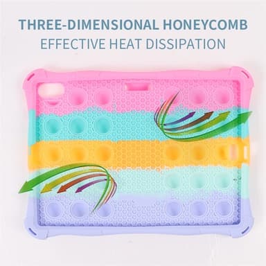 Detta stöttåliga Armor Popit-skal är tillverkat av högkvalitativt naturligt silikon och PC, vilket gör det giftfritt, elastiskt, miljövänligt, återanvändbart och hållbart. Den smarta kombinationen av ett skyddande skal och den populära bubbel-fidget-leksaken ger både funktion och nöje. Upphöjda fidget-bubblor skyddar skärm och kamera mot repor och fall. Det inbyggda stället och det söta tecknade designen gör det enkelt att titta på surfplattan utan att hålla i den. Medföljande rem gör det lätt att bära med sig. En trendig accessoar som också fungerar som en praktisk stressleksak.