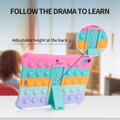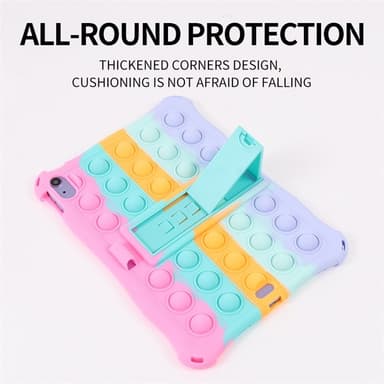Detta stöttåliga Armor Popit-skal är tillverkat av högkvalitativt naturligt silikon och PC, vilket gör det giftfritt, elastiskt, miljövänligt, återanvändbart och hållbart. Den smarta kombinationen av ett skyddande skal och den populära bubbel-fidget-leksaken ger både funktion och nöje. Upphöjda fidget-bubblor skyddar skärm och kamera mot repor och fall. Det inbyggda stället och det söta tecknade designen gör det enkelt att titta på surfplattan utan att hålla i den. Medföljande rem gör det lätt att bära med sig. En trendig accessoar som också fungerar som en praktisk stressleksak.