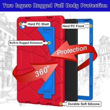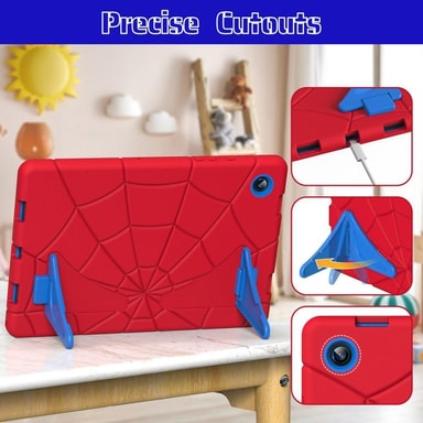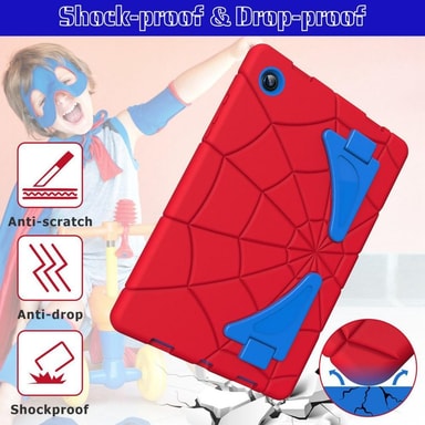 Ett barnanpassat skal med spindelnätsmotiv och ställfunktion till er surfplatta som skyddar bra mot stötar och tappskador.