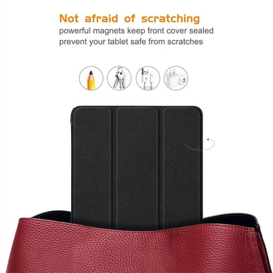 Multi-vinkelstativ: Trifold-designen gör att fodralet kan vikas till ett praktiskt stativ, vilket ger flera betraktningsvinklar för bekväm skrivning, videotittande eller surfning. Oavsett om du arbetar på språng, njuter av dina favoritfilmer eller videokonferenser med kollegor, ger detta mångsidiga stativ den perfekta betraktningsvinkeln för alla situationer. Det stabila och säkra stativet säkerställer att din surfplatta stannar på plats, vilket möjliggör en handsfree-upplevelse.