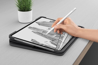 Logitech Slim Folio Pro tangentbordsfodral förvandlar ditt 12.9-tums iPad Pro till en bärbar dator, så du kan arbeta bekvämt var du än befinner dig. Den passar din iPad perfekt och skyddar den från repor, stötar och fläckar.
