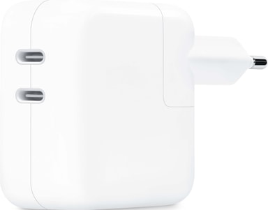 Ladda upp med Apples 35W dubbla USB-C-laddare. De två USB-C-portarna kan snabbt ladda två enheter samtidigt, vilket säkerställer att din Apple-utrustning alltid är redo. Laddaren ger upp till 35W effekt och är kompatibel med de flesta Apple-enheter.Läs mer om produkten