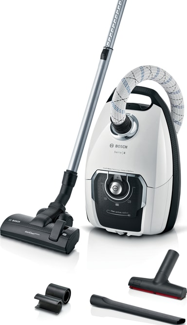 Bosch Series 8 dammsugare med påse BGL8WH3 är en lättanvänd apparat utformad för bekvämlighet med en 12 m extra lång kabel, HEPA-filter för renare luft vid dammsugning och en uppsättning tillbehör som gör uppgiften till en barnlek.
