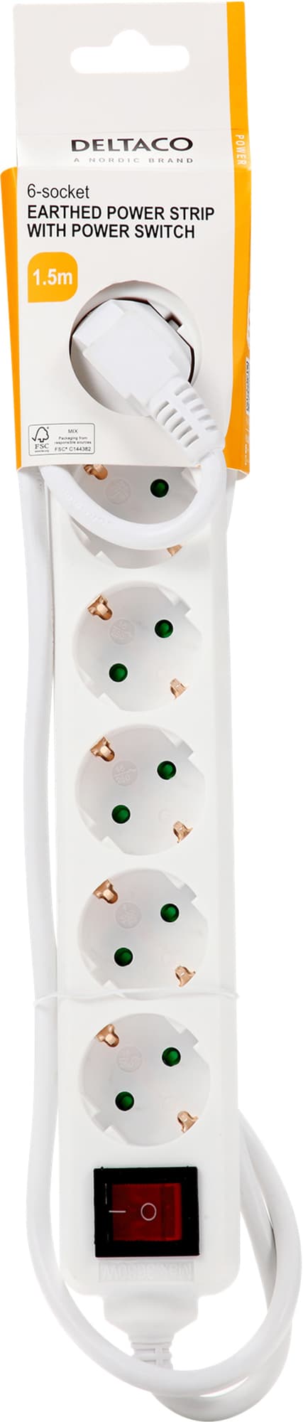 Deltaco grenuttag GT-0650 är en rund 1.5 meters förlängningssladd som har 6 CEE-uttag. De är barnskyddade, jordade och det finns en strömbrytare bredvid dem för extra säkerhet och bekvämlighet.