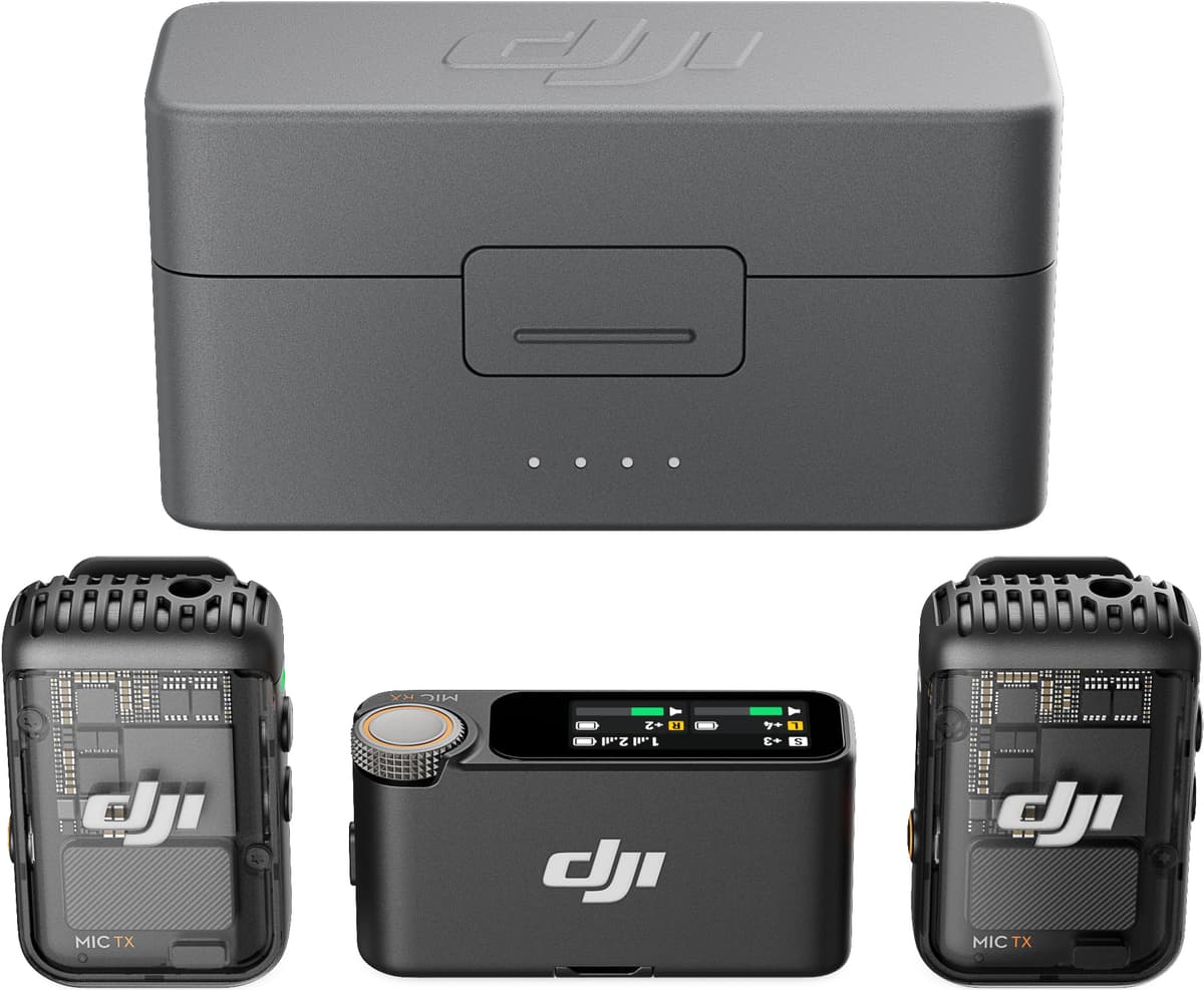 DJI Mic 2 trådlösa sändare, mottagare och laddningsfodral har allt. 2 mikrofoner och en mottagare med USB-C, Lightning och 3,5 mm TRS-anslutningar ger dig brusreducerande inspelning i upp till 18 timmar i sträck.Läs mer om produkten